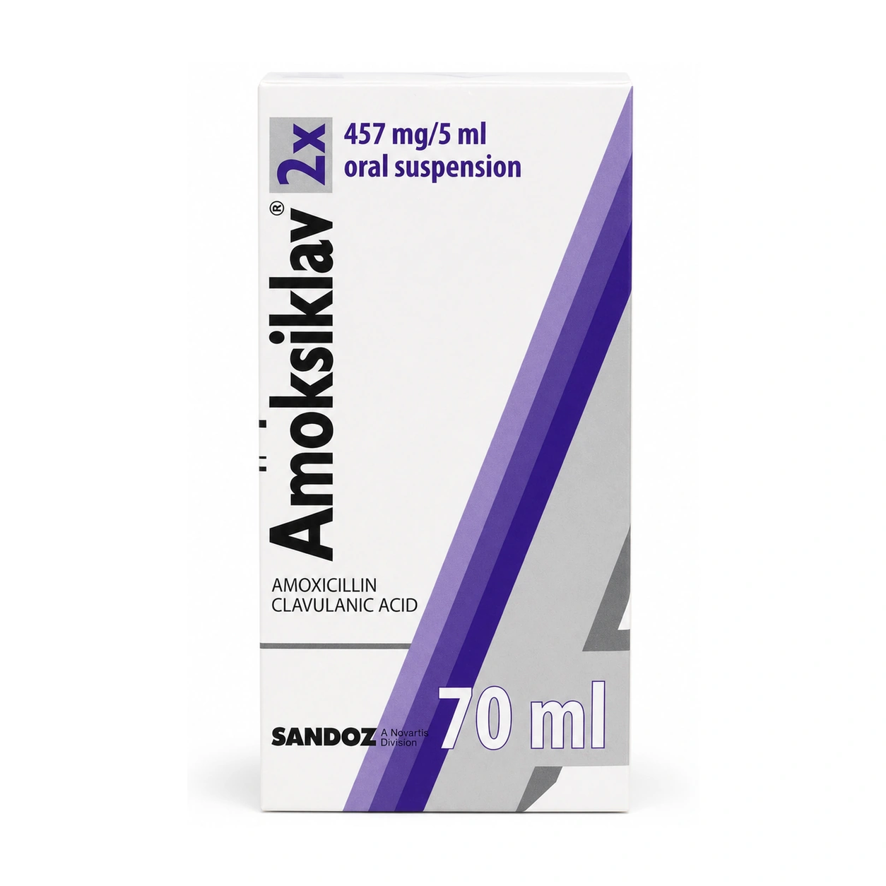 Amoksiklav 2x is an amoxicillin/clavulanic acid oral suspension with a labeled strength of 457 mg per 5 ml.