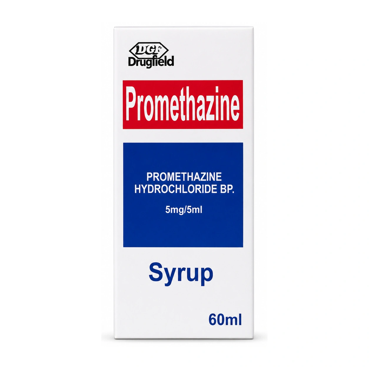 Drugfield Promethazine Hydrochloride BP Syrup provides promethazine 5 mg per 5 ml in a 60 ml bottle, formulated as an oral anti-allergy syrup.