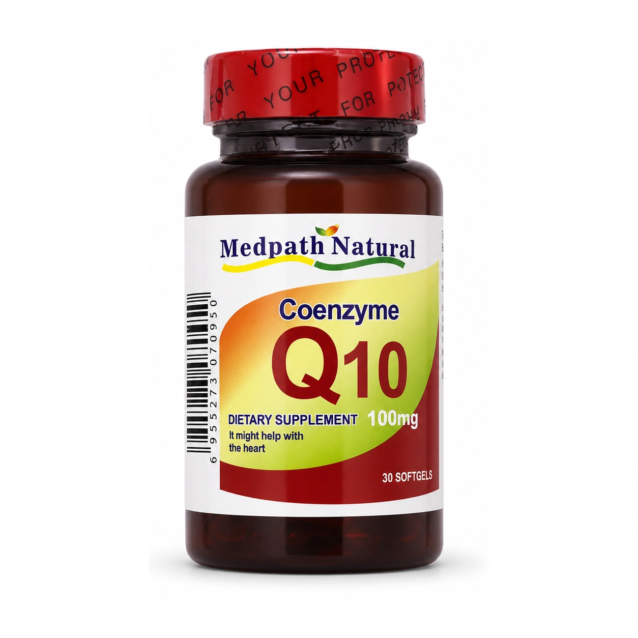 Medpath Natural Coenzyme Q10 provides 100 mg CoQ10 per softgel in a 30-softgel bottle, offering a convenient once-daily supplement format for adults.