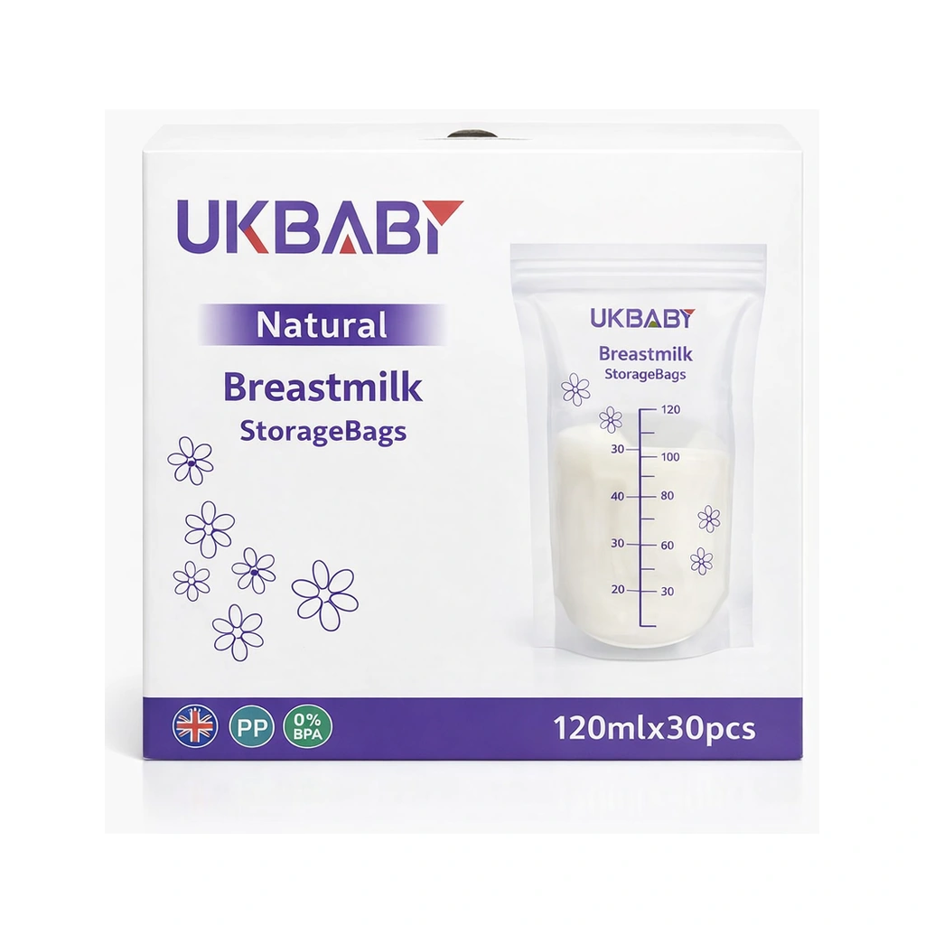 UKBABY Natural Breastmilk Storage Bags provide a practical way to store expressed milk at home or on the go, with each bag sized at 120 ml and supplied as 30 bags per box.