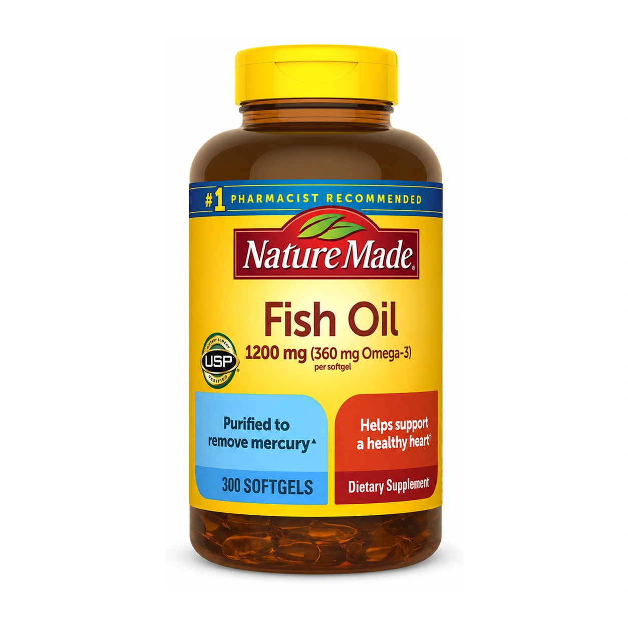 Nature Made Fish Oil 1200 mg is a dietary supplement in easy-to-swallow softgels, with 360 mg omega-3 per softgel and 300 softgels per bottle.