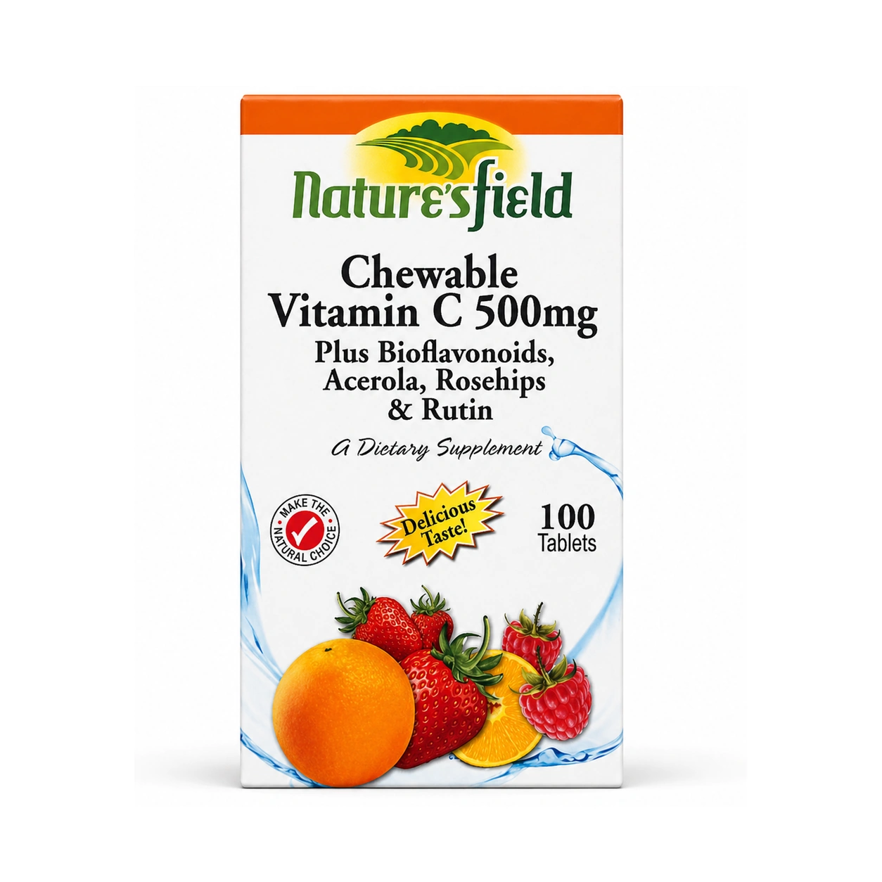 Nature's Field Chewable Vitamin C 500 mg is a dietary supplement in chewable tablet form for people who prefer not to swallow standard tablets.
