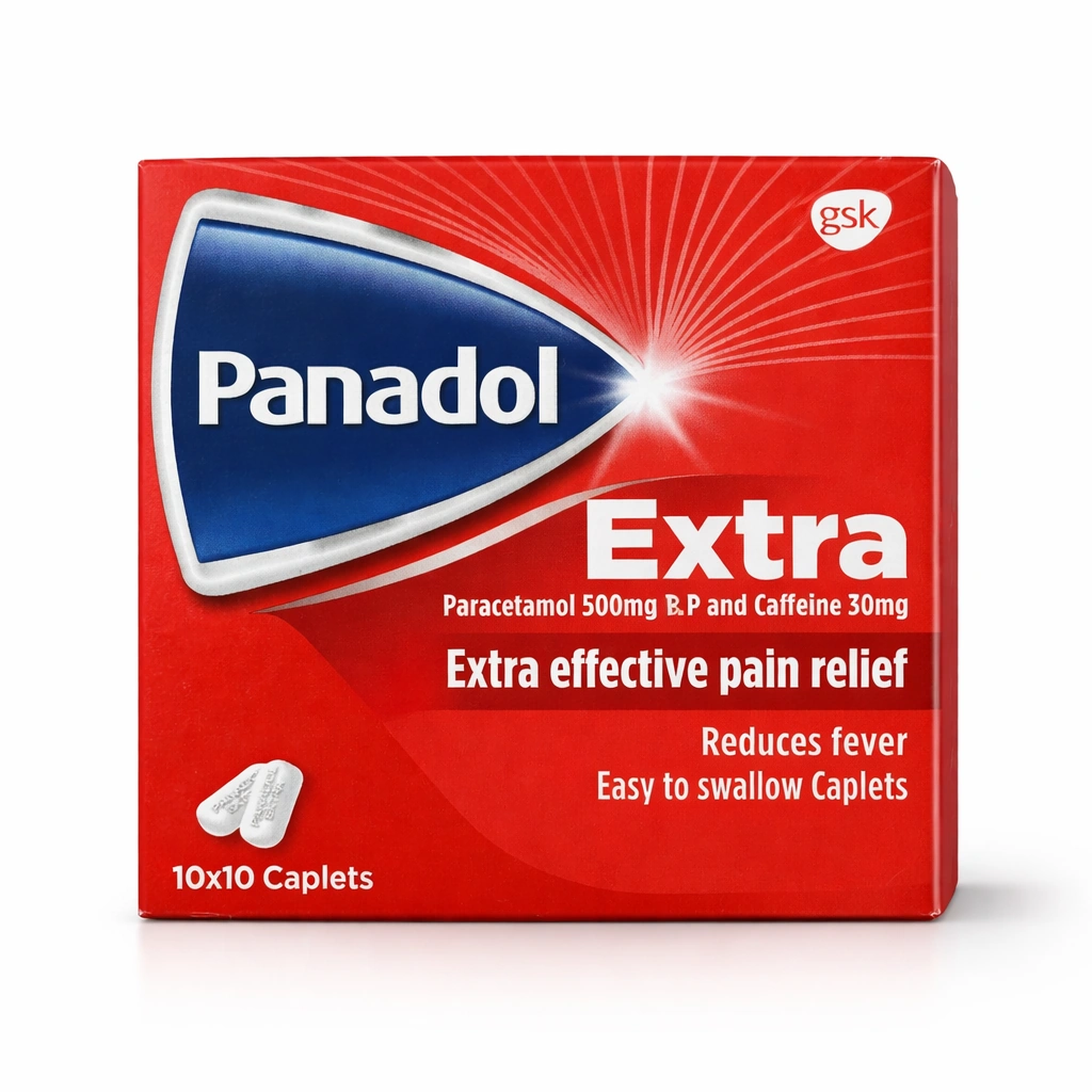 Panadol Extra is an oral pain-relief caplet that contains paracetamol 500 mg and caffeine 30 mg in each caplet, formulated for stronger everyday pain such as headache, toothache, backache, and period pain.