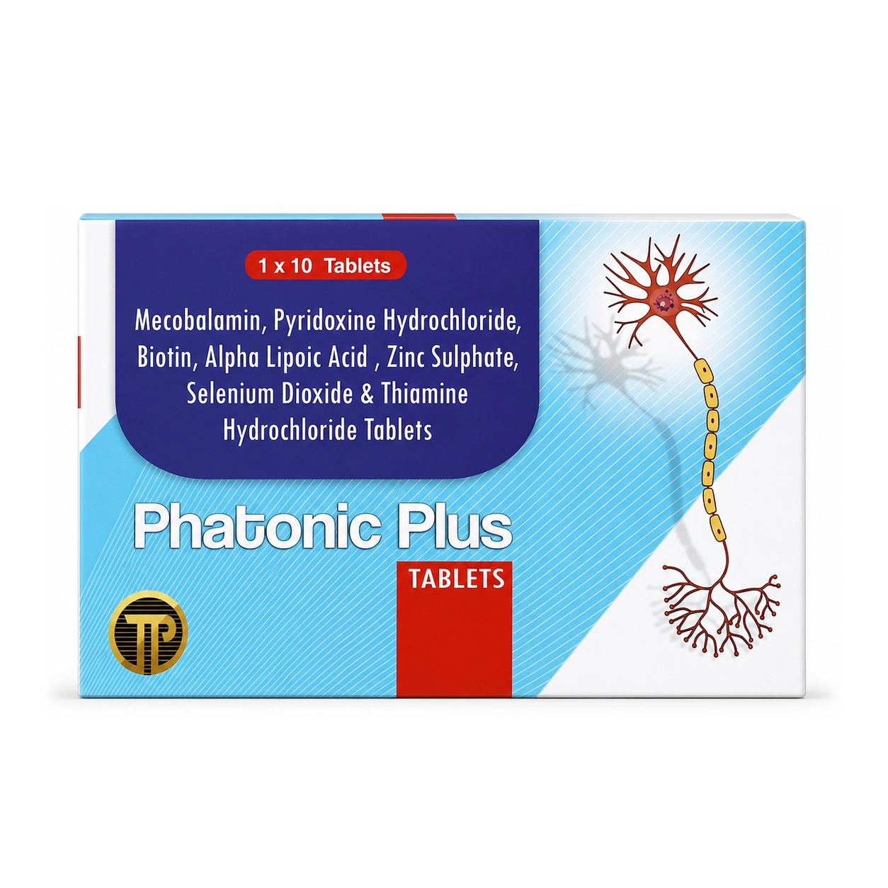 Phatonic Plus Tablets provide a combined neuro-nutrient formula in an easy 1 x 10 tablet presentation for routine supplementation. The pack label lists mecobalamin, pyridoxine hydrochloride, biotin, alpha lipoic acid, zinc sulphate, selenium dioxide, and thiamine hydrochloride.