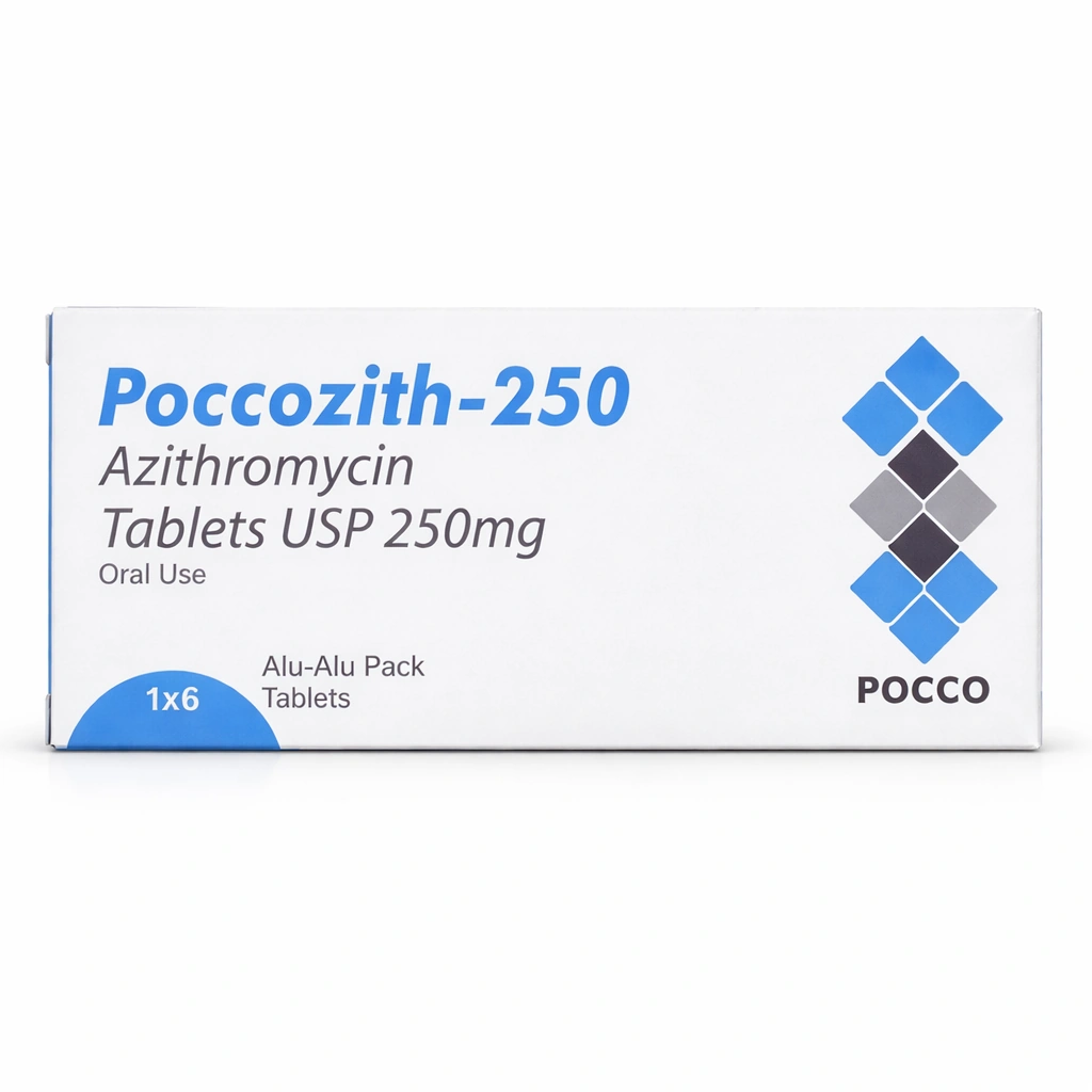 Poccozith contains azithromycin 250 mg per film-coated tablet for oral use, presented in an Alu-Alu blister pack of 6 tablets.