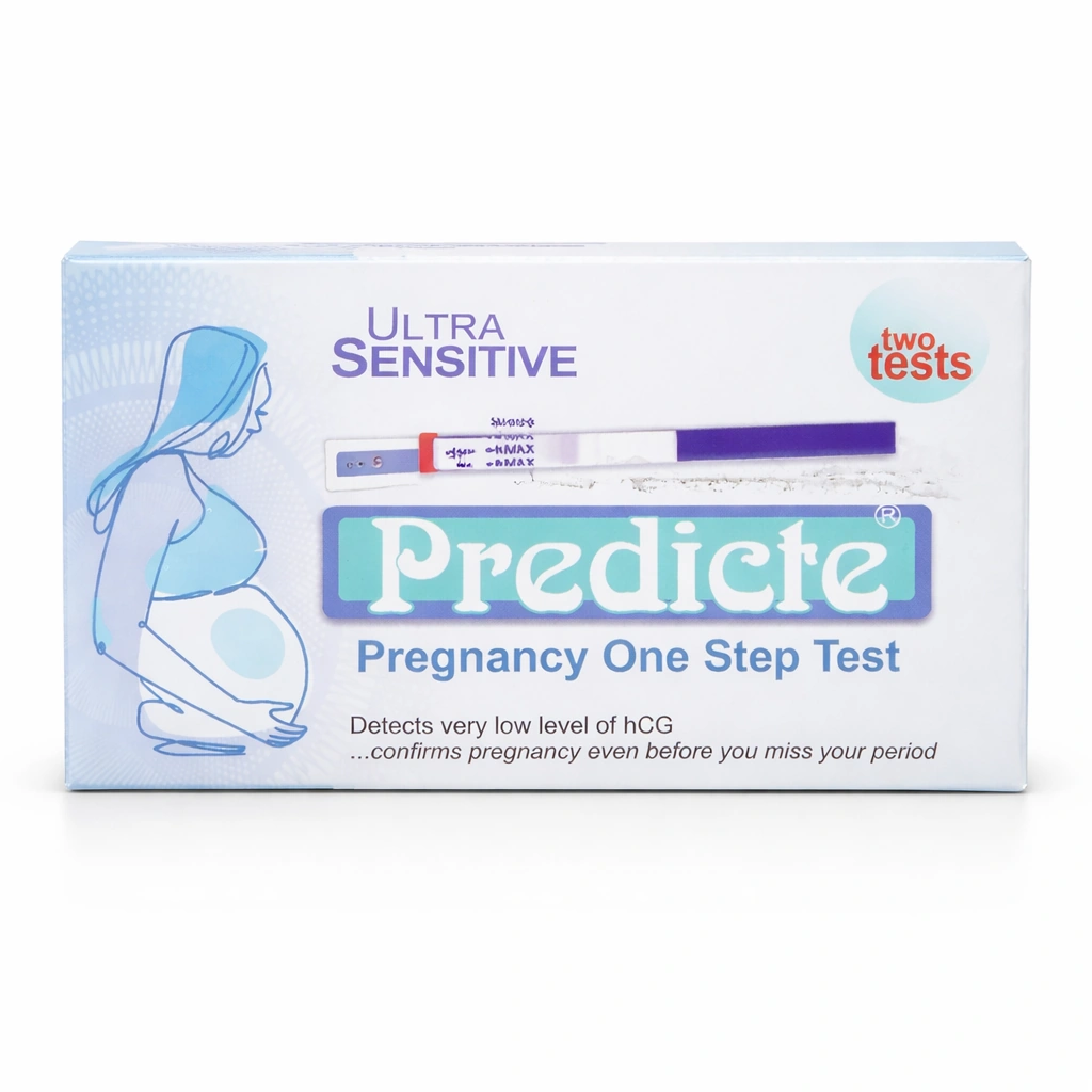 Predicte Pregnancy One Step Test Strips x2 is a home-use urine pregnancy test kit designed for quick, simple screening in a private setting. The pack contains two test strips, allowing repeat testing when needed.