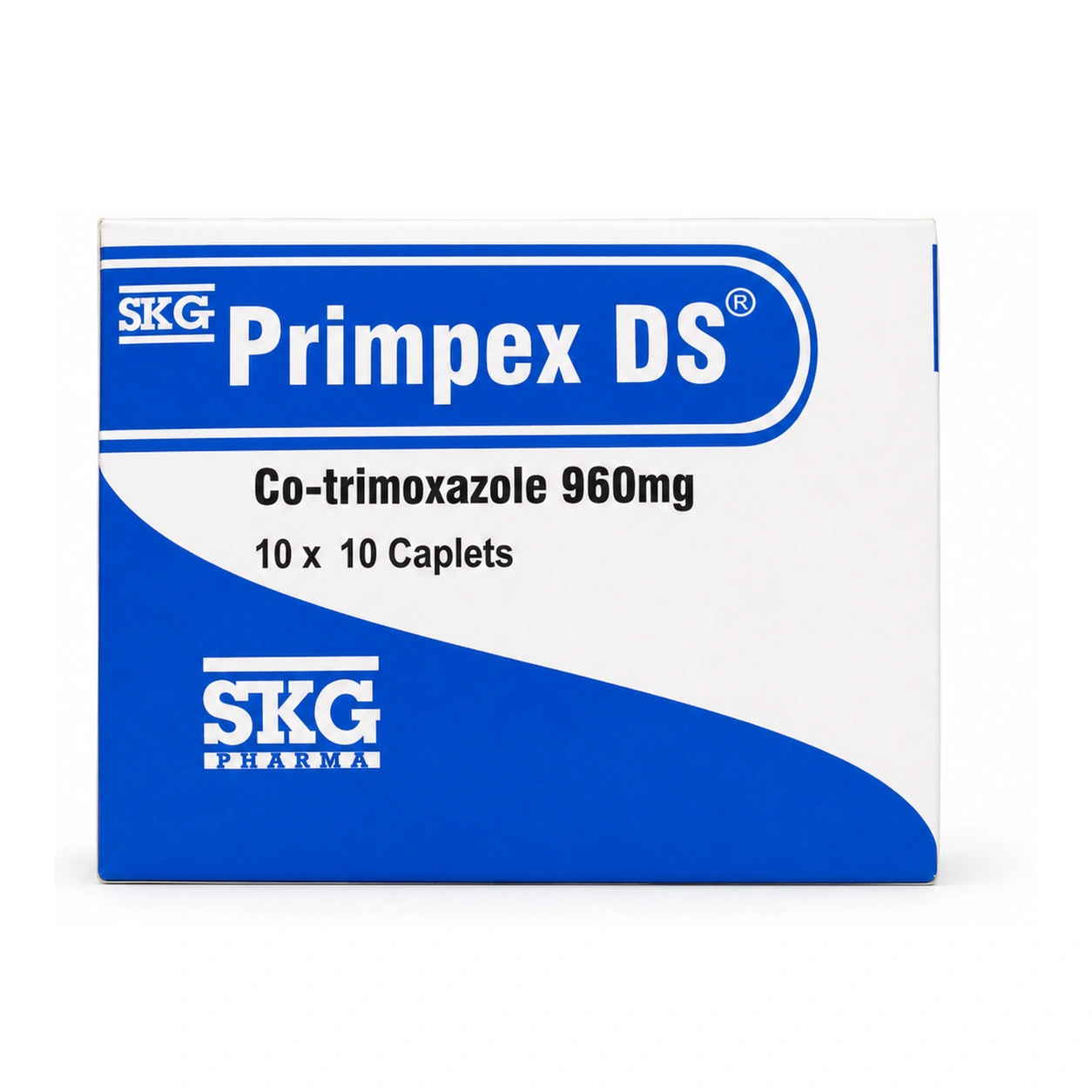 Primplex DS Co-trimoxazole Caplets 960 mg combines trimethoprim 160 mg and sulfamethoxazole 800 mg per caplet in a double-strength oral antibacterial format.