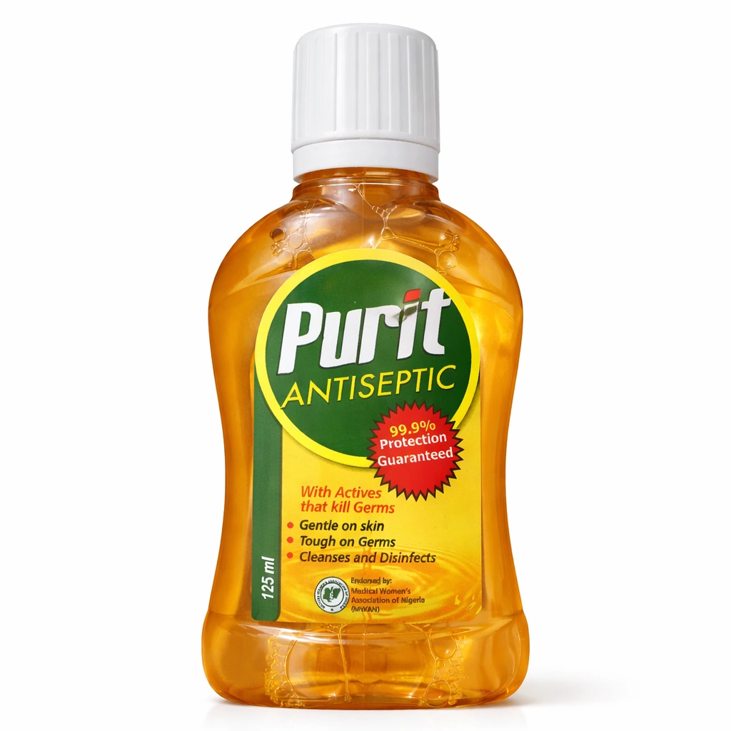 Purit Antiseptic Liquid is a mildly fragranced antiseptic disinfectant designed for everyday family hygiene use. This 125 ml bottle is suitable for first-aid skin cleansing and for diluted home-cleaning routines.