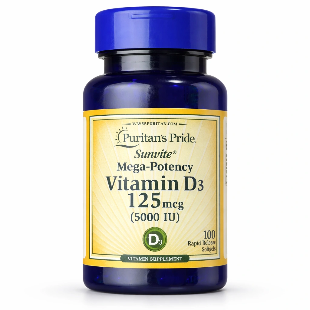 Puritan's Pride Sunvite Mega-Potency Vitamin D3 delivers 125 mcg (5000 IU) of vitamin D3 (cholecalciferol) per rapid release softgel in a 100-softgel bottle.