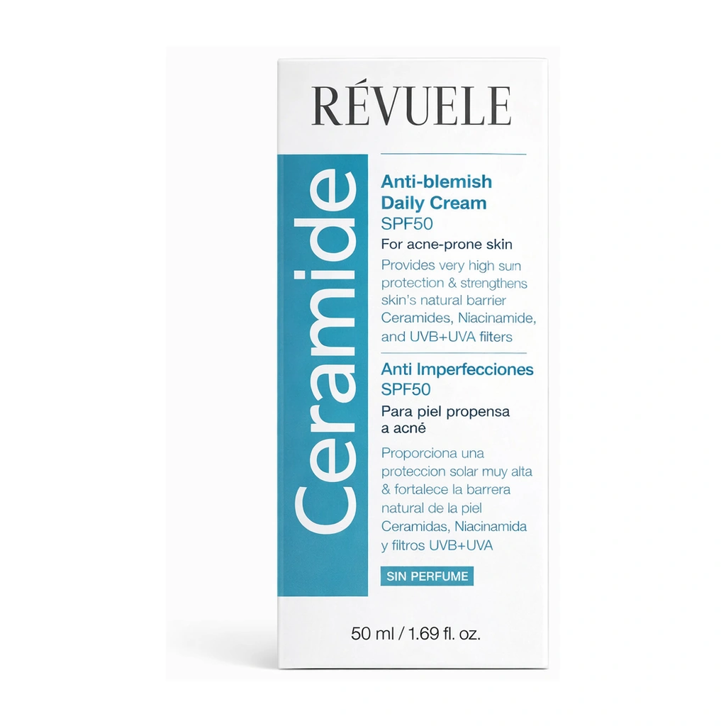 Revuele Ceramide Anti-Blemish Daily Face Cream SPF 50 is a 50 ml daily face cream for acne-prone skin. The fragrance-free formula contains ceramide NG and niacinamide and provides high UVA + UVB protection.