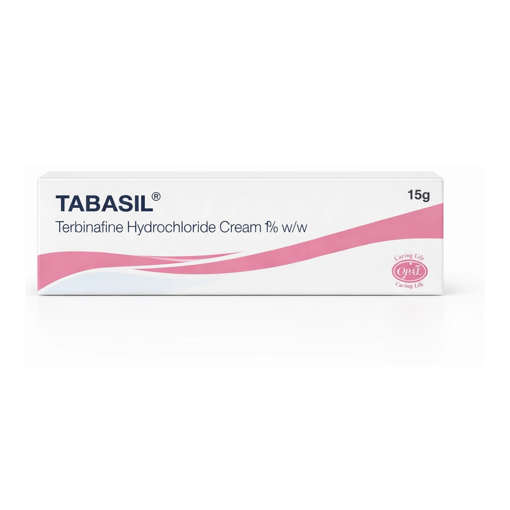 Tabasil Terbinafine Hydrochloride Cream 1% w/w is a topical antifungal cream supplied in a 15 g tube for targeted skin application.