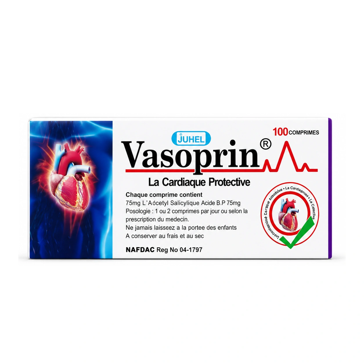 Vasoprin contains acetylsalicylic acid 75 mg per tablet and is presented as a 100-tablet pack for routine low-dose antiplatelet use under medical guidance.