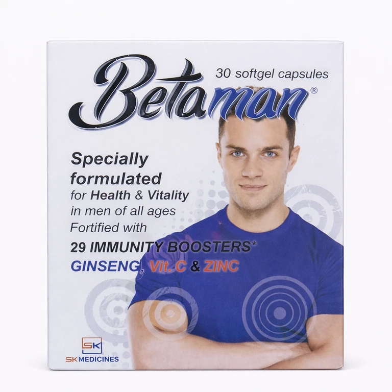 Betaman Capsules are a scientifically formulated multivitamin and mineral supplement designed to support men's overall health and well-being. This comprehensive blend contains essential nutrients, including Vitamins A, C, D, E, and B-complex, along with vital minerals like Zinc, Magnesium, Calcium, Selenium, and Iron.